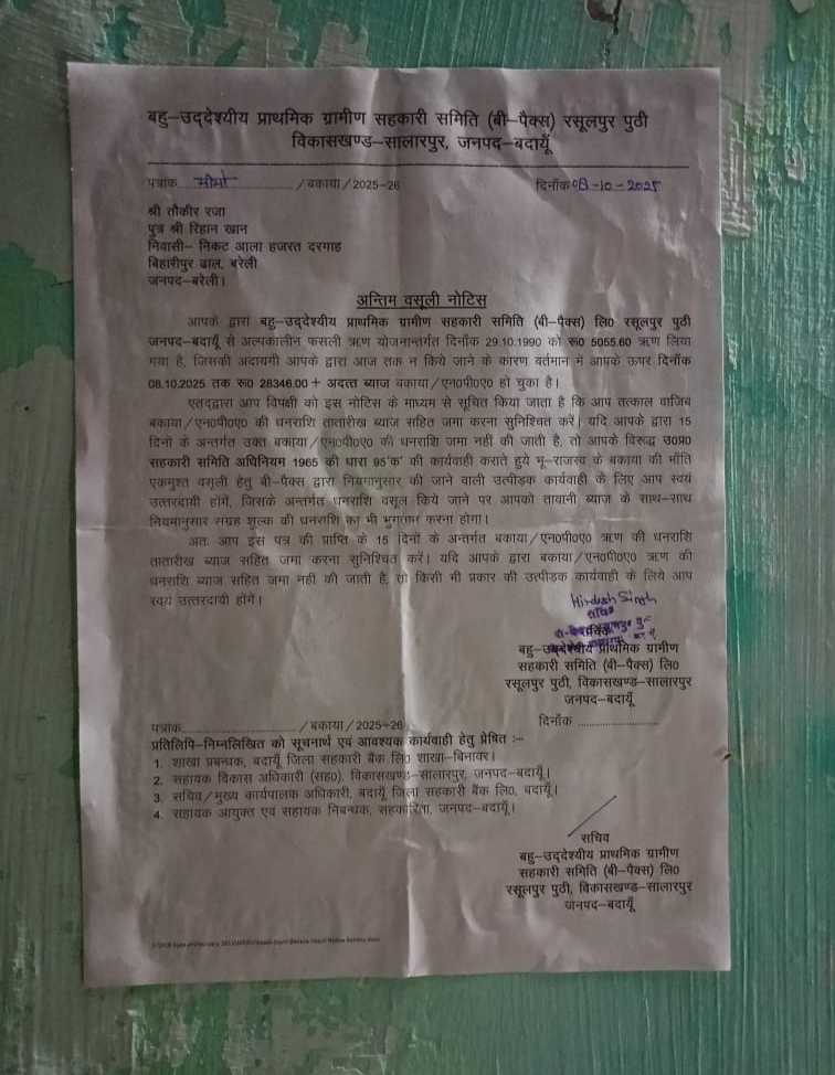 जानकारी के मुताबिक, बदायूं की सहकारी समिति ने यह नोटिस जारी किया है। इसमें मौलाना तौकीर रजा से कुल ₹40,555 रुपये ब्याज समेत जमा करने का निर्देश दिया गया है। बैंक का दावा है कि तौकीर रजा ने साल 1990 में कृषि ऋण लिया था, लेकिन निर्धारित समय सीमा में राशि जमा नहीं की गई। वर्षों से बकाया होने के कारण अब ब्याज जोड़कर रकम ₹40,555 रुपये तक पहुंच गई है।