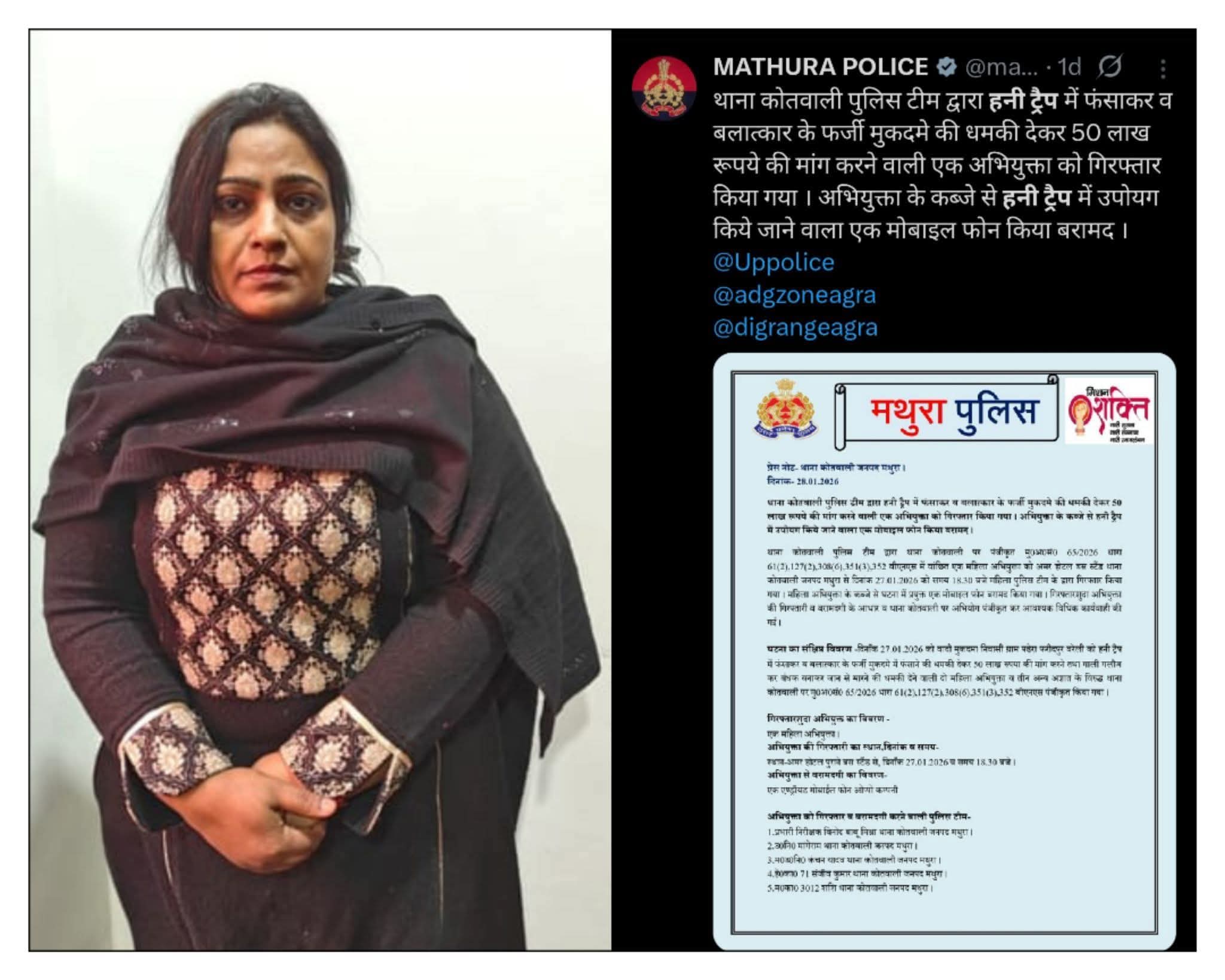 मथुरा में कैलाश मठ के सेवादार को हनीट्रैप में फंसाकर 50 लाख की रंगदारी, महिला गिरफ्तार, तीन फरार