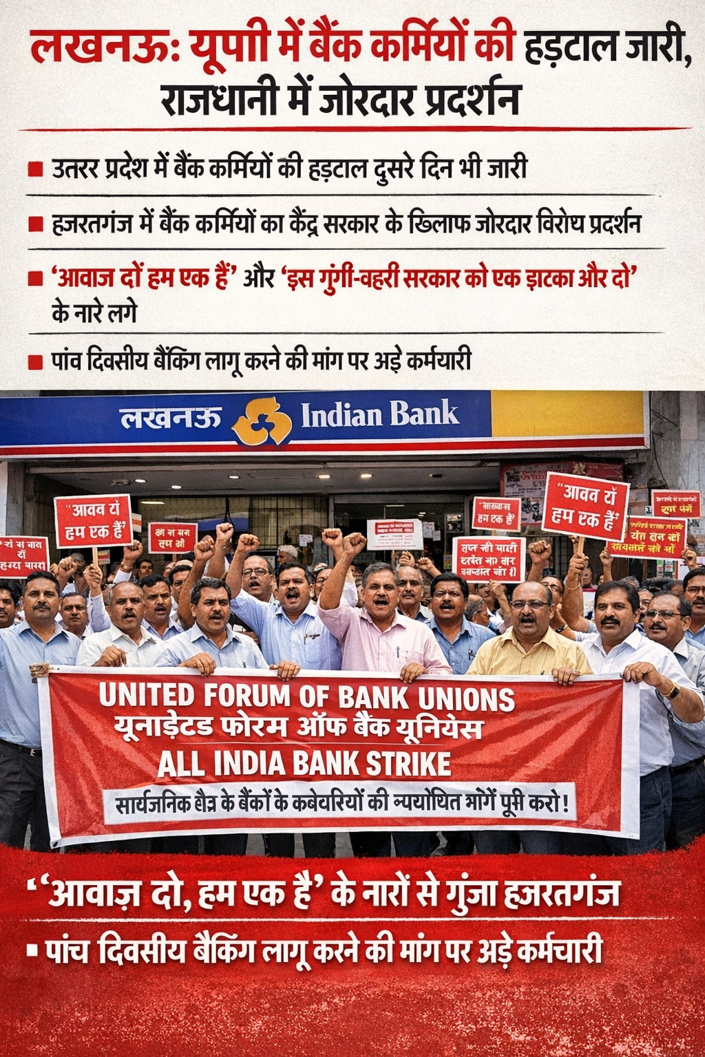 यूनाइटेड फोरम ऑफ बैंक यूनियंस (UFBU) के बैनर तले हजरतगंज स्थित इंडियन बैंक की मुख्य शाखा के बाहर बैंक कर्मचारियों ने एकजुट होकर विरोध प्रदर्शन किया। इस दौरान प्रदर्शनकारियों ने “आवाज़ दो हम एक हैं” और “इस गूंगी-बहरी सरकार को एक झटका और दो” जैसे नारे लगाए।